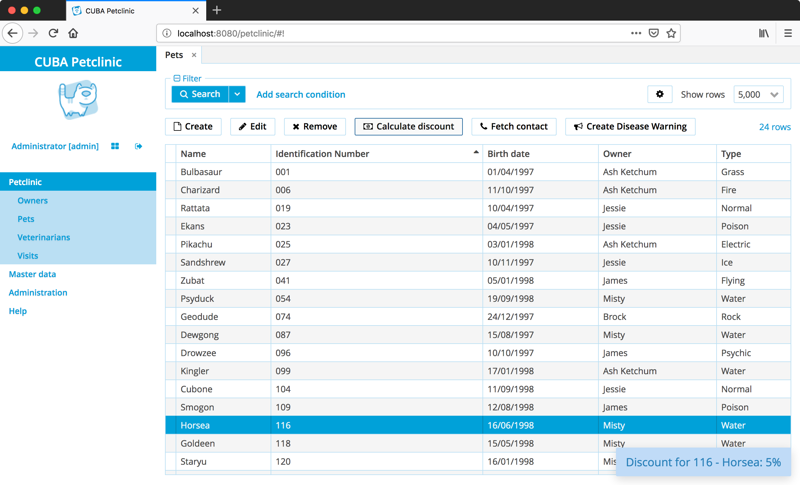 The project that is the basis for this example is CUBA Petclinic. It is based on the commonly known Spring Petclinic. The CUBA Petclinic application deals with the domain of a Pet clinic and the associated business workflows to manage a pet clinic.