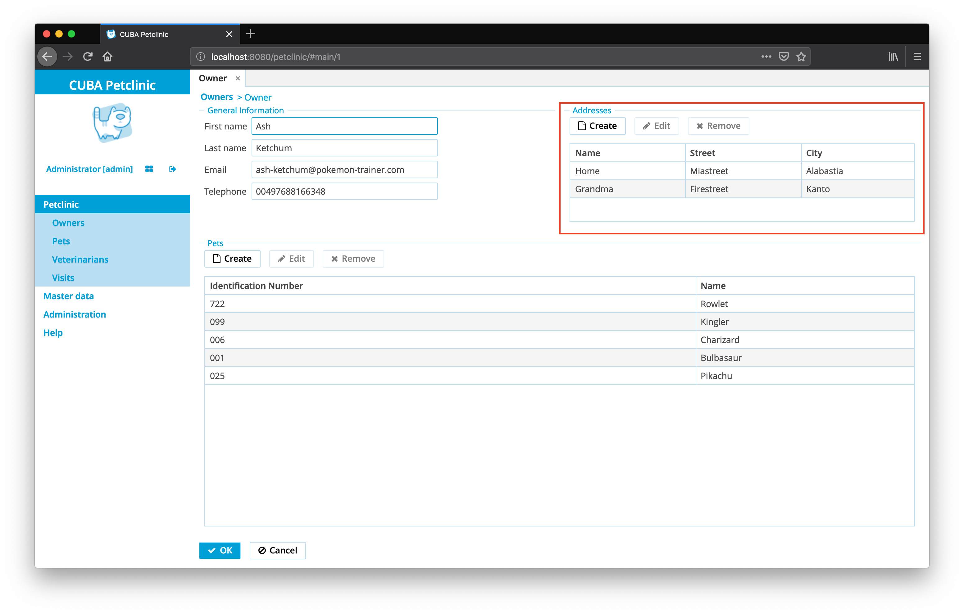 owner-with-pets-and-addressesview of theOwnerediting screen contains theaddressescollection attribute.Addressesitself are loaded with_localview, because theownerattribute of theAddressentity is set only at the creation of a newAddressinstance and never changes after that, so there is no need to load it. -