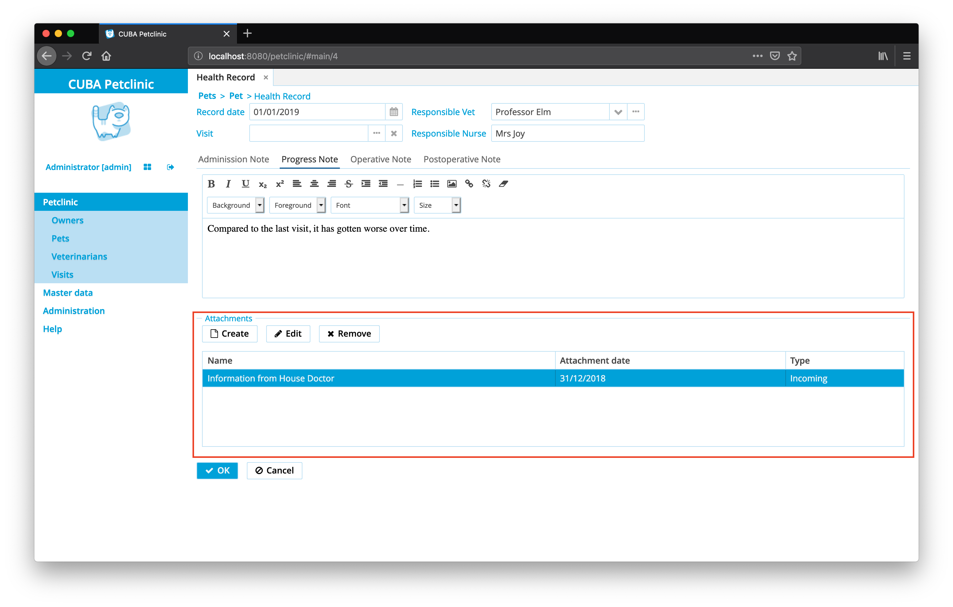 health-record-with-attachmentsview of theHealthRecordclass contains theattachmentscollection attribute. This view is used in thepet-with-owner-and-type-and-health-recordsview of thePetentity which acts as the root view of the edit screen. -