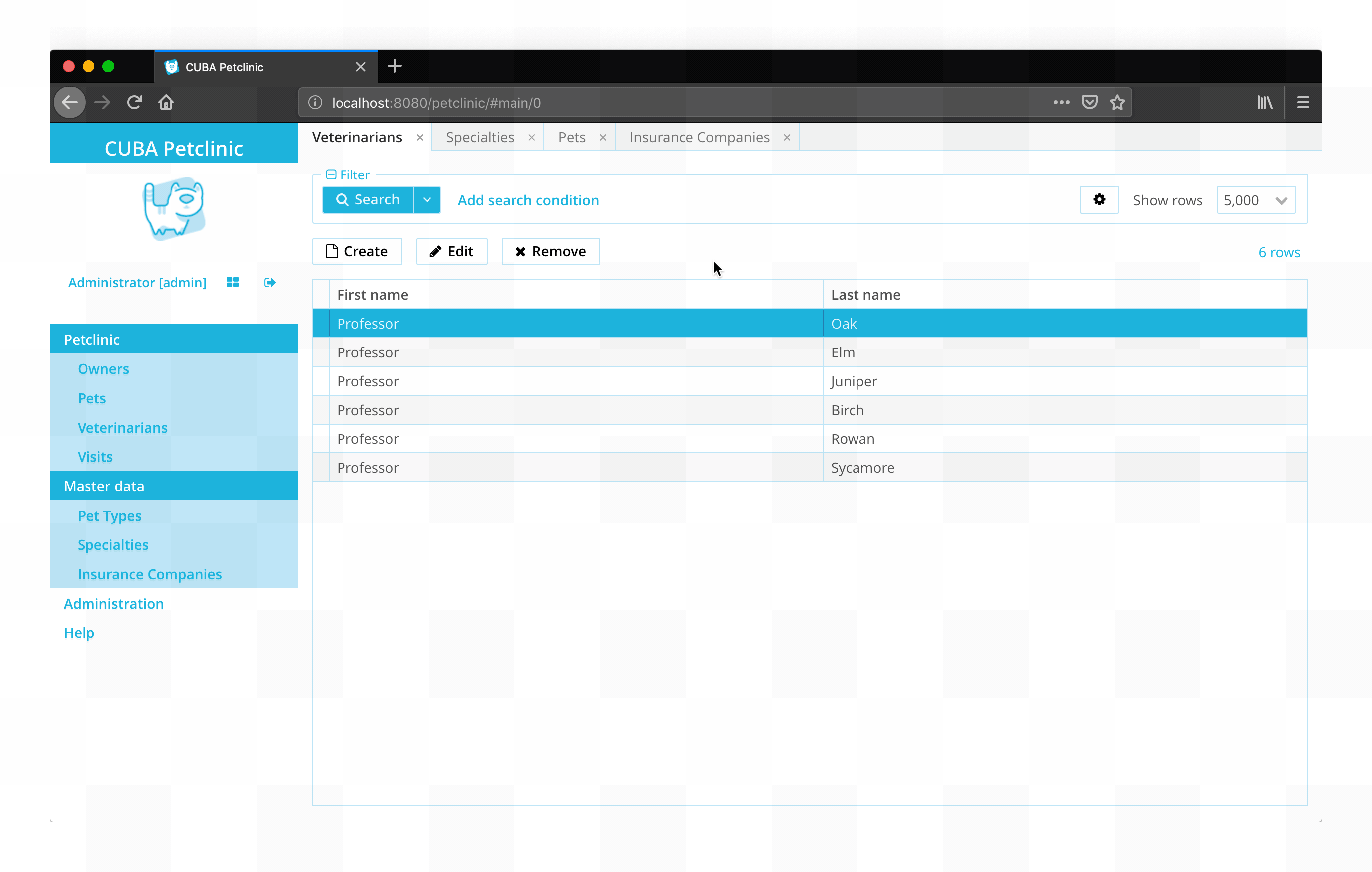 The project that is the basis for this example is CUBA Petclinic. It is based on the commonly known Spring Petclinic. The CUBA Petclinic application deals with the domain of a Pet clinic and the associated business workflows to manage a pet clinic.