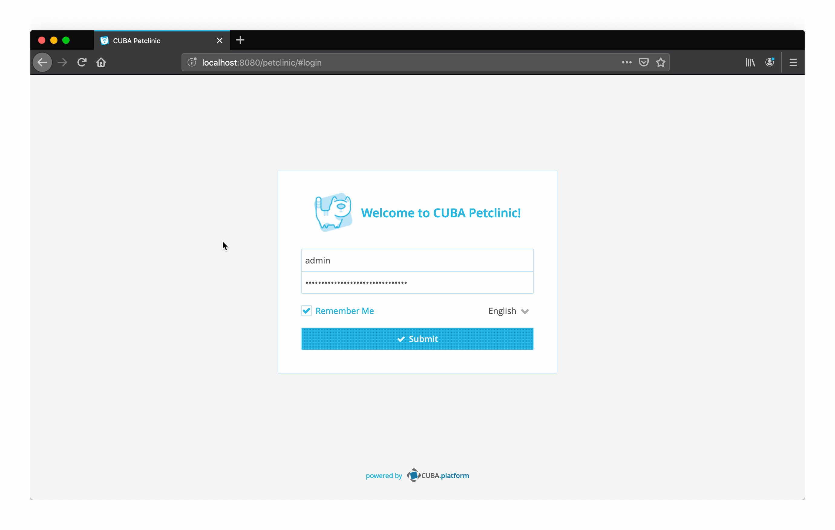 The project that is the basis for this example is CUBA Petclinic. It is based on the commonly known Spring Petclinic. The CUBA Petclinic application deals with the domain of a Pet clinic and the associated business workflows to manage a pet clinic.